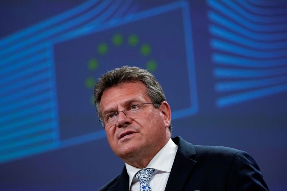 FILE PHOTO: European Commissioner for Inter-institutional Relations and Foresight Maros Sefcovic speaks during a news conference on Brexit at the EU …